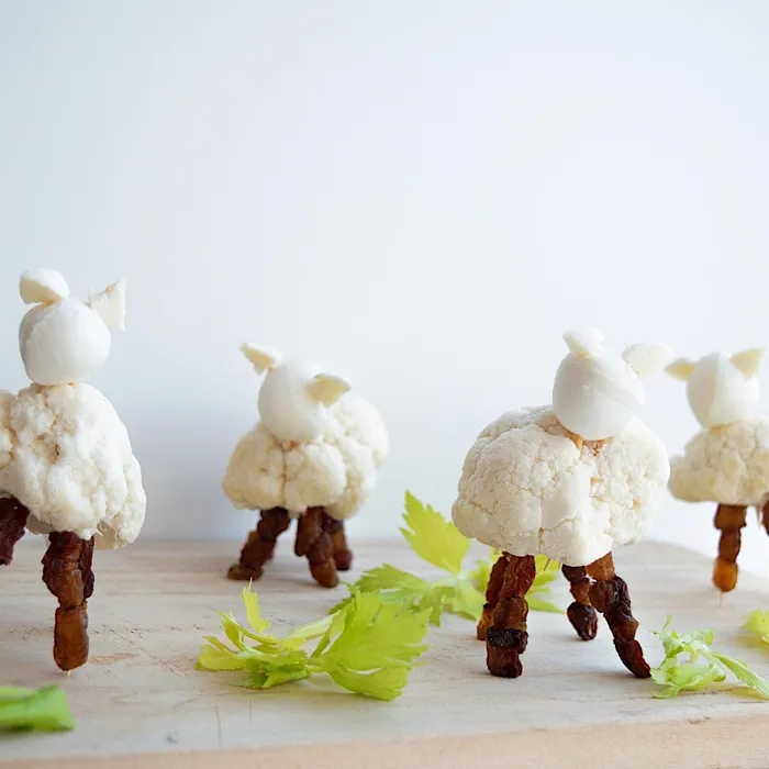 - Steek in de onderkant van het bloemkoollijfje 4 cocktailprikkers als poten.
