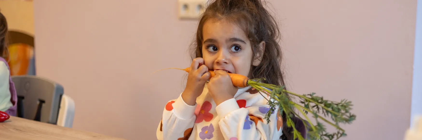 Kleintjes zijn op zoek naar wat anderen doen. Zien ze jou een stukje wortel eten, dan willen zij dat ook. Daarom werkt samen eten ook zo goed. Geef ze een eigen bordje, beker en bestek. Er gaat uiteraard worden geknoeid, maar al dat knijpen, kijken en ontdekken is hartstikke goed voor hun smaakontwikkeling. Ze zien dat jij het lekker vindt, dat samen aan tafel zitten gezellig is, en een beetje routine vinden ze fijn. Een liedje, een verhaal of een spelletje over groente doet het ook goed. Onze verhalen met Moestuinvriendjes zijn zeker niet per ongeluk ontstaan.